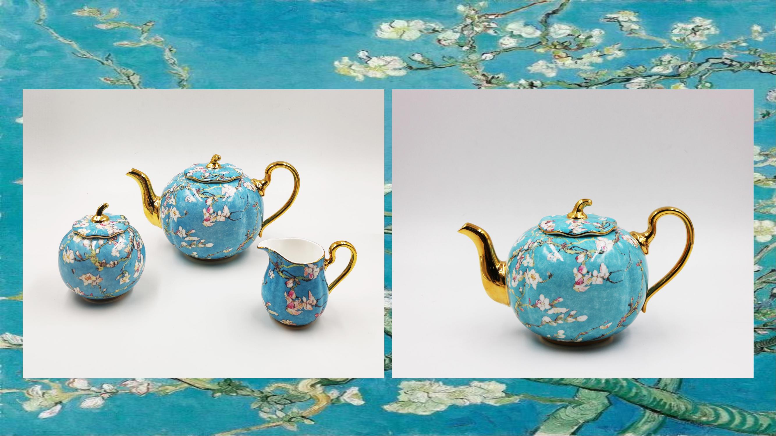 - Pretty Floral Embossed Gold Tea Set Milk Pot Sugar Can Tea Pot 3pcs Sets Made by Fine Bone China with Van Gogh Painted Apricot Blossom Design