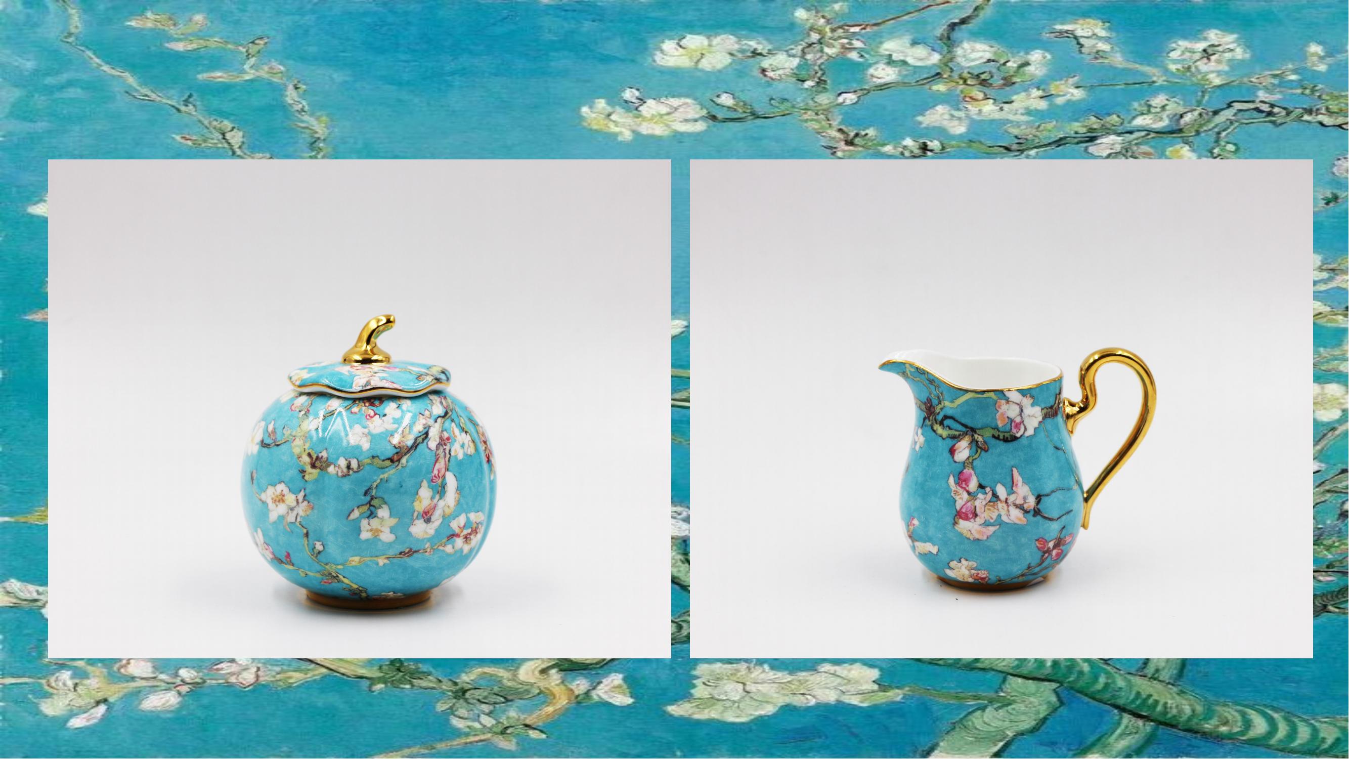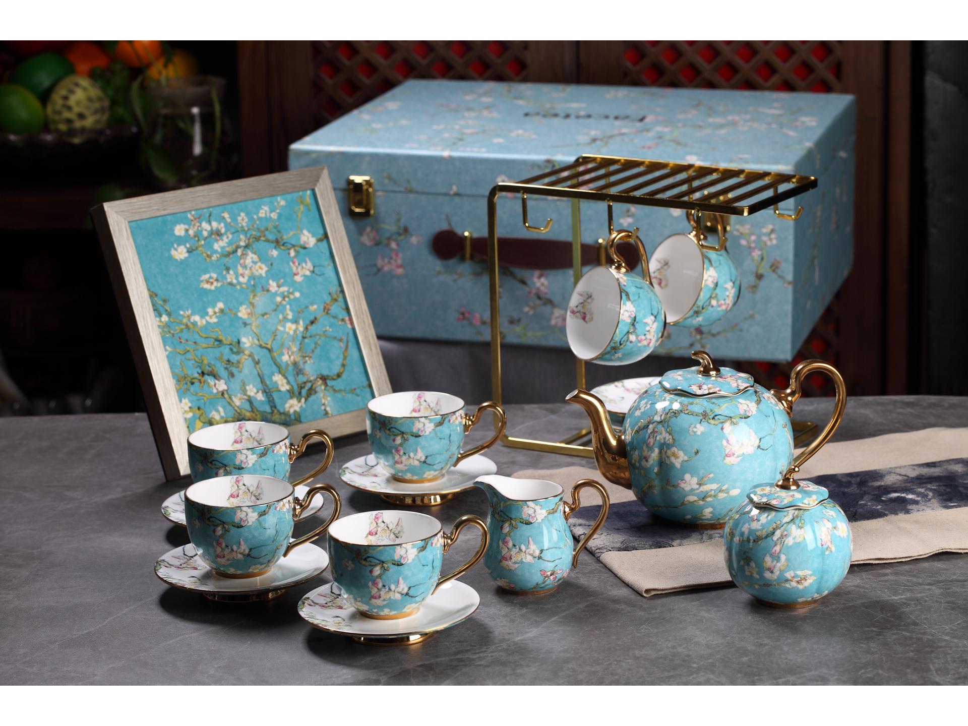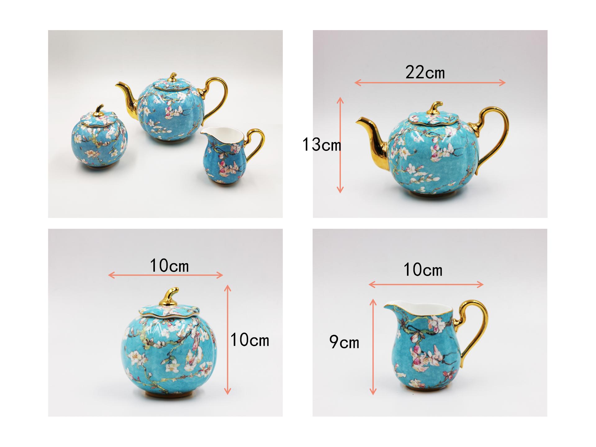 - Product Name: Pretty Floral Embossed Gold Tea Set Milk Pot Sugar Can Tea Pot 3pcs Sets Made by Fine Bone China with Van Gogh Painted Apricot Blossom Design